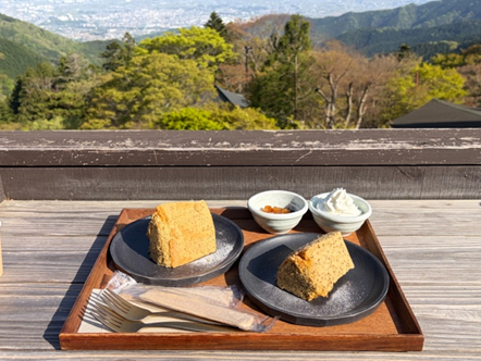 本来は名物の升ティラミスをいただきたかったのですが、ちょうど売り切れてしまったため、今回はシフォンケーキを注文。トッピングに、さっぱりとした生クリームとお供えリンゴのソースを添えて、美味しくいただきました。